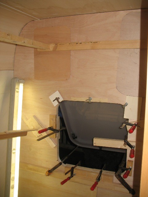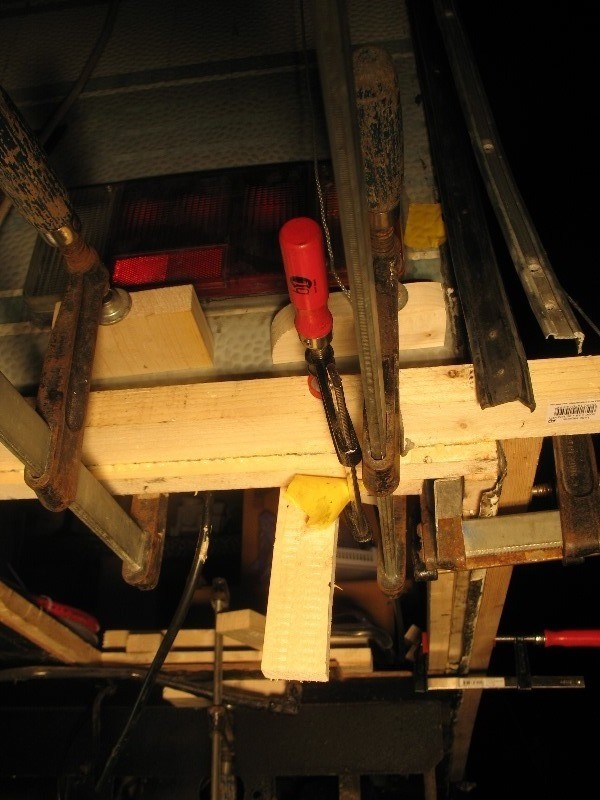 Plan für Montag: 0. störenden geqollenen Kleber abschneiden 1. an rechtem Heck den Bodenrahmen einbringen und die restlichen Bodenleisten einkleben 2. Rücklicht links mit Holz umkleben und dortigen Bereich, der reichlich durch Alufraß durchlöchert ist, mit Holz auskleben und Löcher abdichten 3. senkrechtes Rahmenholz der Seitenwand hinten links sowie horizontale Leisten am unteren Blechende einkleben 4. Bodenplatten einmessen