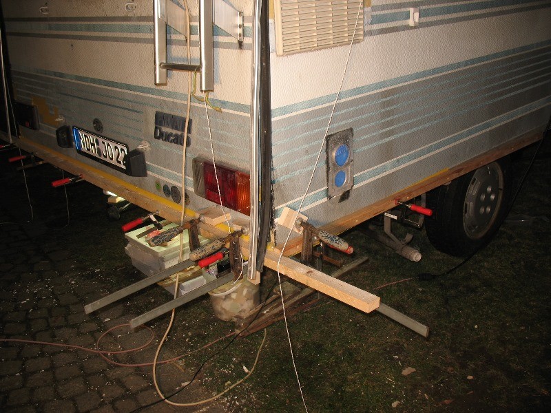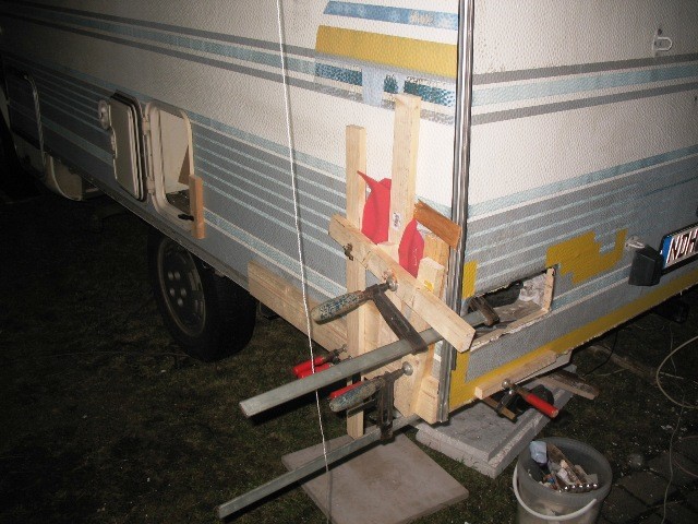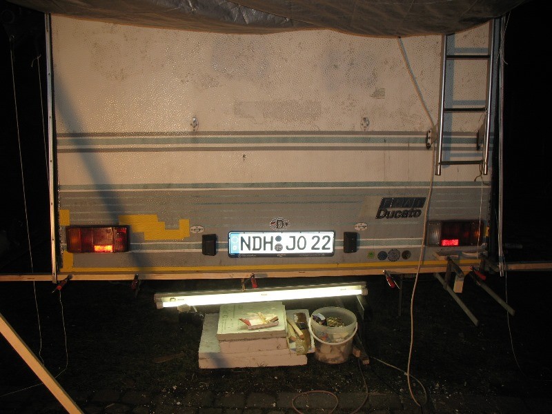 Die Arbeitsreihenfolge von heute: 0. vorbereitend alle Löcher mit Isolierband von aussen abgeklebt 1. Heckwand bekam am unteren Blechende zuerst einen durchgehenden Balken über die gesamte Breite des Fahrzeugs eingeklebt, die Seítenwände sollen dann daran anstoßen; diese waagerechte Leiste wurde verdeckt mit den beiden mittleren Rückwandstützen verschraubt (180er hatte ich gerade noch) 2. rund um die Heckleuchte rechts wurde das Stabilisierungsholz verklebt; mit etwas Luft zur Leuchte, damit noch Dichtungsmaterial rein kann 3. Seitenwand rechts, am Blechende zum Boden wurde Holzlatte eingeklebt; hier war extrem viel durchgerostet, Schrauben- und Krampenlöcher sowie Perforationen, so dass stellenweise Sika und stellenweise Ruderer verarbeitet wurde; Belche die sich weiter in den Altbestand der Wände hinein gelöst hatten, wo ich keine Arbeiten von innen vornahm, habe ich mit langer Tülle und blind mit Sika hinterspritzt ... und hoffe auf Festigkeit und Dichtigkeit 4. zwei Fußbodenleisten rechts hinten eingeklebt