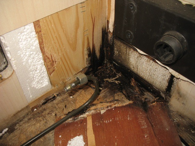 Habe heute die andere Ecke freigelegt, Möbel ausgebaut, Wasserboiler demontiert (SCHOCK BEIM BOILER :!: ) und die ersten feuchten Platten entfernt. Hier ist ausser den kompletten Konstruktionshölzern in der Wand (sichtbar je ca. 15-20 cm Länge) auch der Boden mit "Bewuchs" überzogen und morsch sowie naß. Unterm Rücklicht kann ich von innen nach aussen ins Freie fassen. :cry: Sieht fast so aus, dass es sich entlang der Längswand zum Beifahrer weiter nach innen zieht. --> hier muss ich dem Gkück noch richtig auf die Sprünge helfen. :| Was ich als einzig beruhigendens am Heck finde ist: alle senkrechten Hölzer und so gut wie alle waagerechten Hölzer ab einer Höhe von 30 cm oberhalb des Fußbodens sind völlig naturfarben, trocken und fest! FREU FREU! ...also die, die ich bisher gesichtet habe.