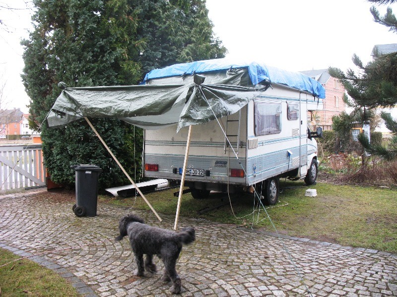 Zur weiteren Abdichtung gegen Wasser habe ich das Womo komplett mit Folie auf Abstandhaltern abgedeckt. Die Folie geht über beide Dachkanten längsseits und vorn + hinten bis jeweils zur Dachschräge. Am Heck werde ich noch eine weitere Plane spannen, damit auch das von der Dachplane ablaufende Wasser nicht über die senkrechten Kanten eindringen kann.