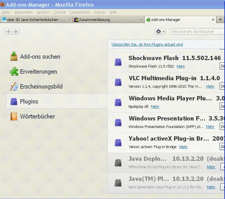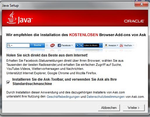 zB. Fenster1 ist Systemsteuerung -> Software Fenster2 FF -> Extras -> Add-ons im Moment bei mir aber deaktiviert ![]() ![]() und da es munter weiter updates gibt, hier nochmal der Hinweis bei der Installation Haken weg bei der Ask Toolbar, die braucht kein Mensch. ![]() generell gilt toolbars braucht kein Mensch und Adobe bietet auch immer einen McAffee Security Scan an, den ebenfalls keiner braucht. Hallo allseits, für mich ist am wichtigsten das man jährlich den Virenschutz erneuert und nicht nur einmalig beim Kauf des Computers und den Virenscanner regelmässig laufen lässt, Zeitpunkt in Form von Tag/Uhrzeit bestimmt man selbst. Ich selbst habe seit Jahren Norton Internet Security und noch nie einen Virus gehabt. Java bleibt aktiv auf Nachfrage auf meinem PC da ich nicht weiss wo der Internet Entwickler das verwendet und Updates werden niemals automatisch installiert das gilt aber für alle Software einschl. Windows. Egal welche Toolbars angeboten werden für den Browser so muss jeder für sich überlegen ob man die braucht, meine Einschätzung dazu keine einzige.