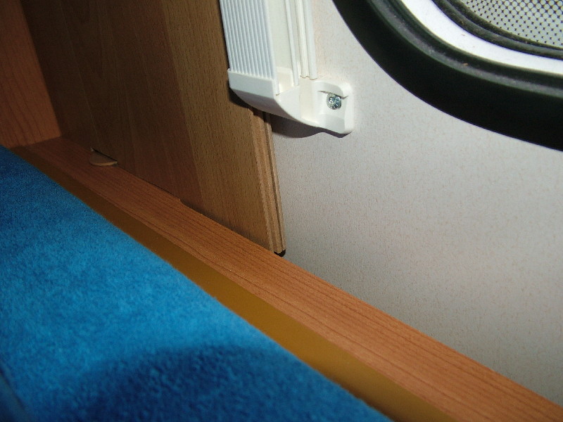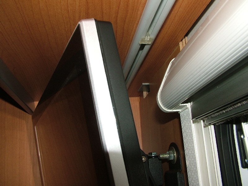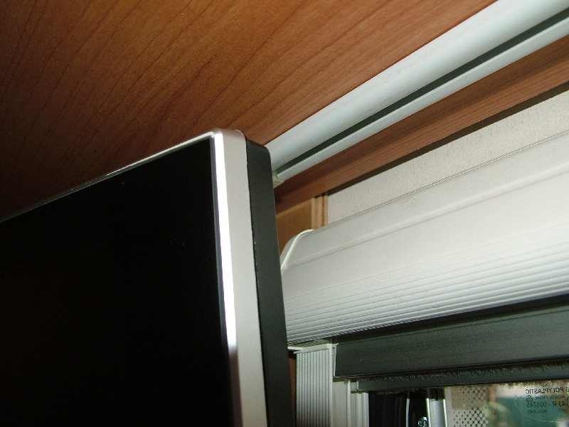 Das optisch fast gleiche Brett ist genau so breit, daß es zwischen Raumecke und Rpllo passt. In der Höhe ist es 3 cm länger und oben und unten mit Ausschnitten versehen, ähnlich einem Gebiss mit Zahnlücken. Diese Lücken greifen oben und unten in die Ausparungen der Hinterlüftungs-Öffnungen. Unten steht es auf dem Holz des Lattenrost-Rahmens einfach auf. Da das Brett dünner ist wie die Tiefe dar Öffnungen habe ich zwischen Brett und Aussenwand Schaumstoff geklebt, damit es mit Spannung fest sitzt und nicht wackelt. An diesem Brett ist nun der TV-Halter angebracht. Auch führe ich die Kabel mittig hinter dem TV durch das Brett und dahinter unsichtbar Richtung Receiver.