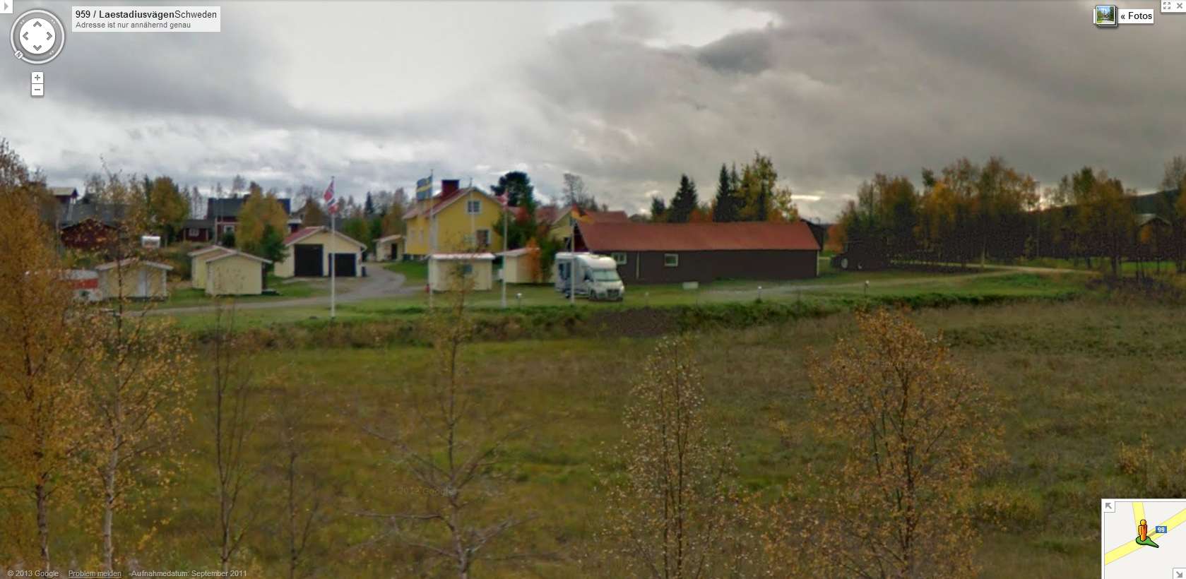 Mitte September 2011 kamen wir aus Nordnorwegen zurück. In Karesuando (nördlichstes Dorf in Schweden) übernachteten wir auf "Sandlövs Camping" (einfacher Platz, also bestens für Womos geeignet). Am nächsten Morgen sahen wir, wie ein Google Streetview-Wagen vorbei fuhr. Also Kamera raus und abgedrückt: ![]() Nun haben wir immer mal wieder nachgesehen, ob unser Womo nun dort zu sehen ist. Es hat lange gedauert, aber jetzt ist es zu sehen: ![]() Oder direkt und live bei Maps: --> Link viele Karsten Ja ja es geht auch andersrum. Klasse gemacht. Klasse, so ein Foto hätte ich von uns auch gerne mal Mein WoMo sieht man schon in google-Maps, aber noch nicht in google-earth. Die Streetview ist schon eingezeichnet, aber noch nicht aktiviert. ![]() Und wie man sieht, ist der Parkplatz nur 1cm länger als das WoMo. Jetzt wisst ihr auch, warum ich kein 8m WoMo gekauft habe. :lach: