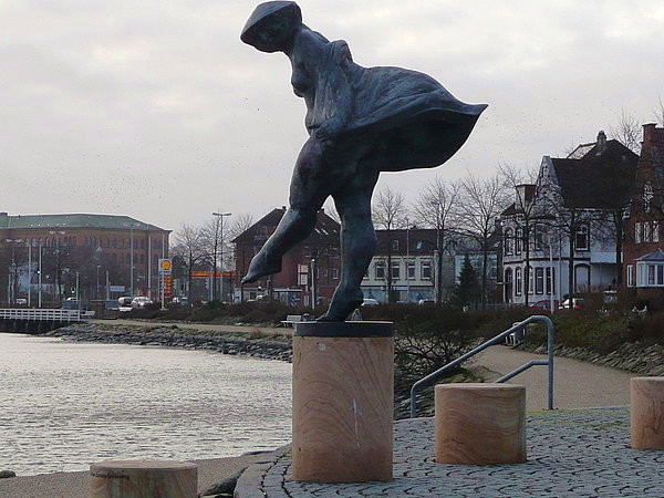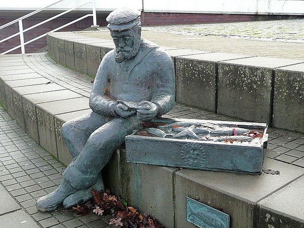 Der lebensgroße Fischer putzt seinen Fang an den Treppen hin zum Kai