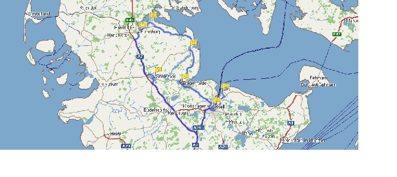 In Kiel verfahre ich mit prompt an genau gleicher Stelle wie bei der Ankunft dort. Wieder läßt mich das Navi dort im Unklaren über die Streckenführung .. blödes Teil !