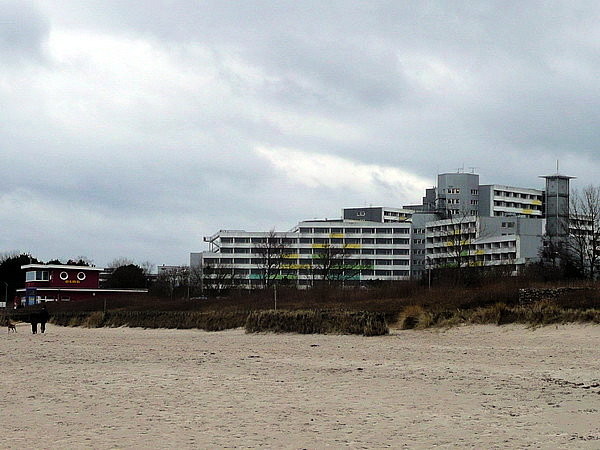 Auf dem Rückweg kommen wir an dem Wellenstrandbad und Sauna vorbei. Die Tür öffnet sich und ein Pärchen nur mit Handtuch bekleidet läuft in Richtung Ostsee. Wir sind gespannt: gehen sie rein oder nicht ?? Schließlich begnügen sie sich doch mit einem saukaltem Fußbad und der eisigen Brise und traben wieder zurück ins Warme.