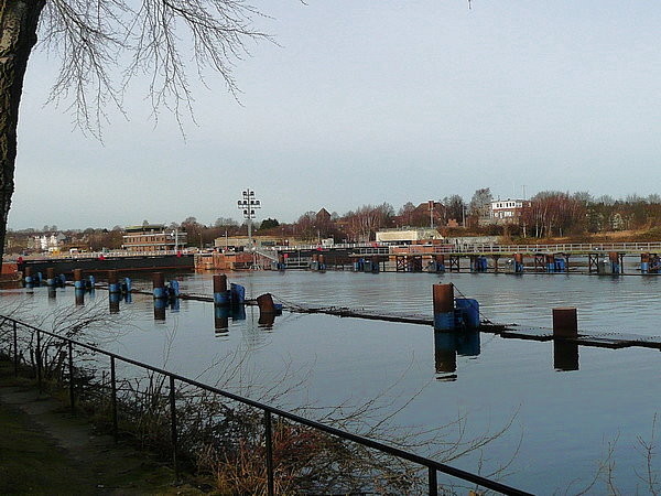 Wir stehen an der Nordmole. Rund um uns rum lauter Marine-Gelände.