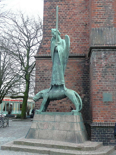 Neben dem Eingangsportal steht hier die Statue „Der Geistkämpfer“ von Ernst Barlach. Damals wohl schon nicht besonders gut angekommen … die Statue ...