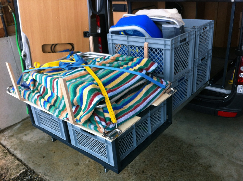 Das Ganze funktioniert jetzt seit einem halben Jahr perfekt, zur Zeit sind die leichten Campingstühle "montiert", im Sommer haben war dann etwas voluminösere Stühle dabei, aber auch die passen genau auf die Ablage drauf.