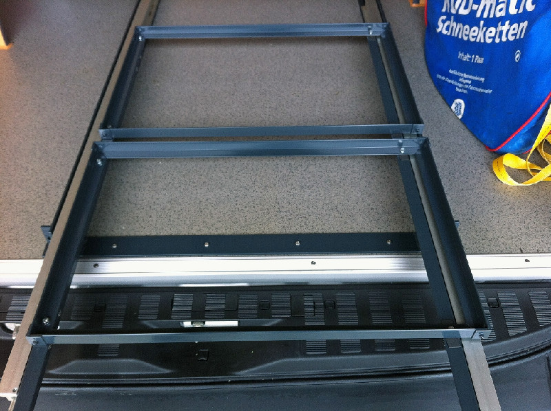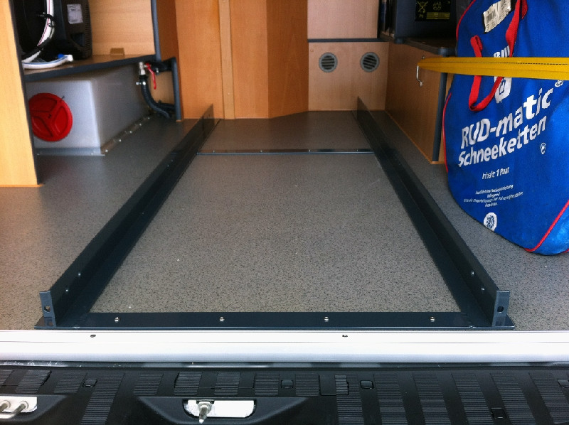 Für die Aufnahme der Schienen hat mir ein Metallbauer eine Konstruktion aus Aluminium "gebraten": die Teleskopschienen sind an Alu-T-Profilen 60/60/4 mm im Abstand von ca. 56 cm befestigt, die zur Stabilität miteinander verschweisst wurden. Die Alu-T-Profile sind am vorderen Ende an den Gewindebolzen verschraubt, die durch das Loch im Bodenblech und im Laderaumboden gesteckt wurden.