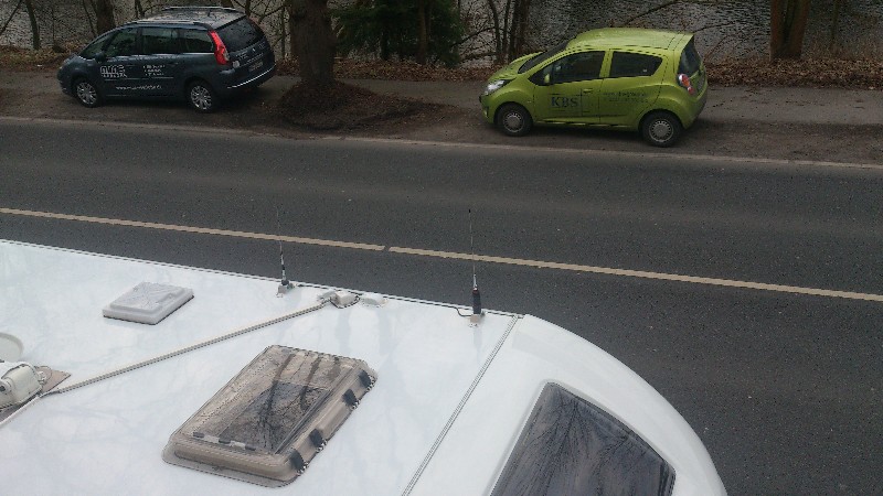 Hallo, die Antennen sind da, wo sie hingehören, auf dem Dach natürlich :) Eine für 10 u. 11 m, eine für 2 m und 70 cm: ![]()