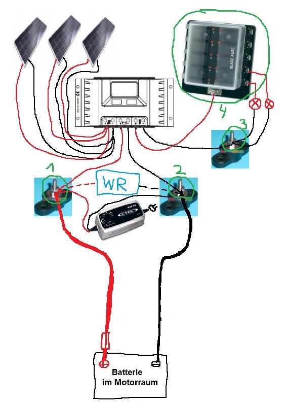 An alle Kabelenden eine Ringöse mit gleichem Lochdurchmesser (M6,8,10) anbringen. Alle Ringösen gemeinsam mit einer durchgesteckten Schraube verbinden. Federring + Mutter drauf fertig. Ggf. die Verbindungsstelle in einer Aufputzverteilerdose unterbringen. Die Schraube kann auch als Stehbolzen mit der Dose verschraubt sein. Spätere Erweiterungen können einfach draufgelegt werden. Welcher Solarladeregler ist denn verbaut? Hat der evtl. die Möglichkeit einen zusätzlichen Kabel-Temperatur-Fühler an die Batterie zulegen? Ladespannung messen war schon genannt. ![]() @Karlo, ich wollte grad ein Bild hochladen, bin dazu aber glaub ich noch nicht befugt, da ich hier neu bin. Ich schildere mal das Problem: Bei Solarbetrieb wurde die Batterie tatsächlich überladen. Sie hat gekocht und der Laderegler hat 17,5 Volt Spannung angelegt als sie bereits voll war. Als Laderegler habe ich einen 30A von Westech installiert, denn es auf der Herstellerseite aber leider nicht mehr gibt. Tatsächlich kann ich die Ladeentspannung einstellen, diese wird vom Gerät aber nicht eingehalten. Ich habe wie gesagt das Problem reproduzieren können. Wenn ich die Verbraucher trenne bzw. die Massekabel direkt zur Batterie führe, funktioniert der Ladevorgang perfekt. Landstrom bzw. EBL gibts nicht. Die Aufbaubatterie wird aktuell auch nicht von der Lima geladen, leider ist mir aber bewusst, dass ich das in Zukunft auch nicht machen kann, da ich die Massen dann wieder verbinden müsste. Das schmerzt ein wenig, da es für die Zukunft auf jedenfall interessant wäre. Für den Moment hat jedoch eine funktionierende Solaranlage Priorität. Vielen Dank für eure raschen Antworten! :) @Wohnwagen-Otto Ich glaube wir ticken ähnlich. Diese Lösung habe ich profisorisch im Urlaub zusammengschustert und war ziemlich stolz darauf :) Für das +Kabel ist mir diese Variante jedoch zu heiß. Bei der Masse sollte es aber ungefährlich sein oder? Ich hatte jetzt nur auf die Frage mit der Stromverteilung geantwortet, der Regler müsste erst mal getestet werden ob der Funktioniert 17 V Endladespannung ist etwas zu hoch. Solarregler mit 17,5V, hm, kann ich kaum glauben wenn ja dann würde ich den mal tauschen und dann messen. Hast du mehr Info über das Teil? Pläne, Beschreibung?