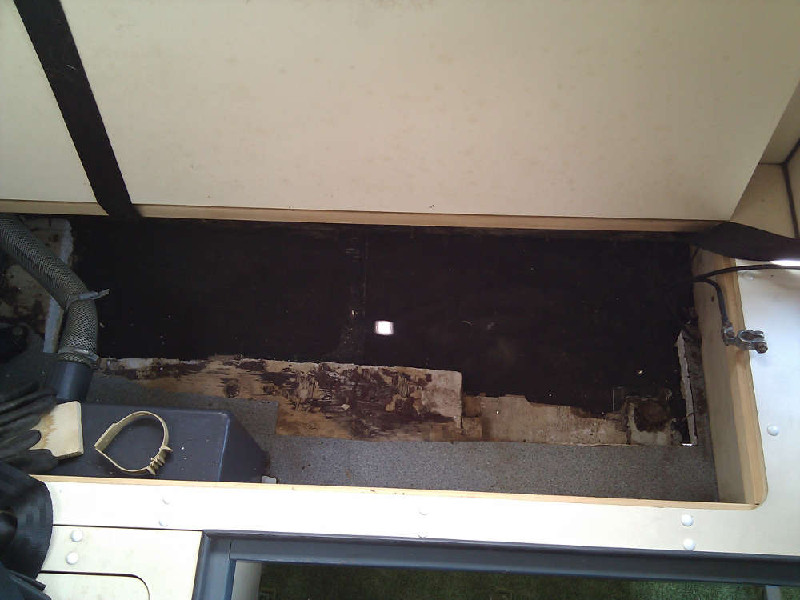 Im vorderen Drittel unter der Sitzbank bzw. hinter dem Fahrersitz habe ich einen Feuchtschaden entdeckt. Die Bodenplatte dürfte aus einer Art Kunststoffverbund sein, weshalb die einen noch wirklich guten Eindruck macht und nicht betroffen zu sein scheint. Hier ein paar Bilder vom Schaden (Ich hab das feuchte Holz bzw. die Dämmplatten schon entfernt.