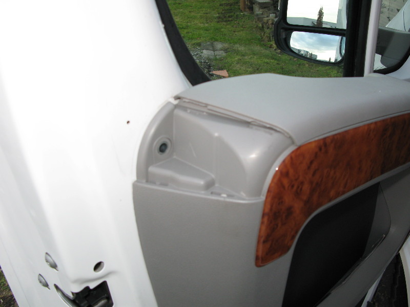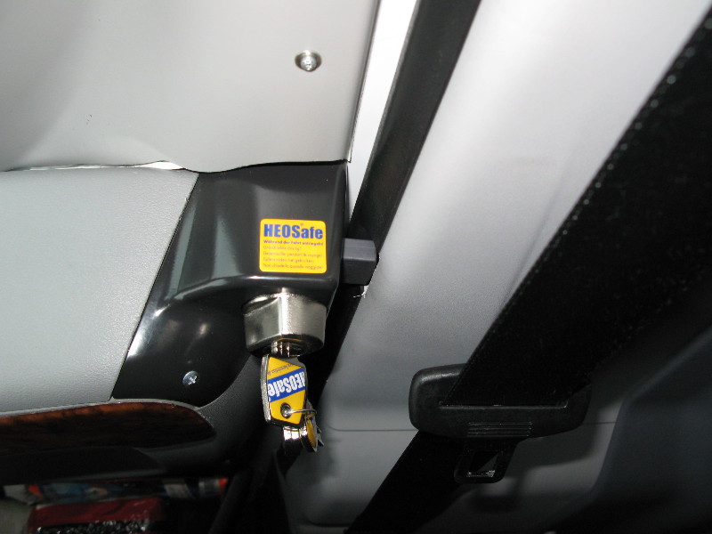 Einbau ist gut beschrieben und wenn keine Seitenverdunkelung angebracht ist, sehr einfach und schnell zu erledigen. Da wir Remistar-Jalousien verbaut haben, musste diese erst entfernt werden(5 Schrauben). Dann kann die Abdeckung der Armlehne abgehebelt und das Schoss in die bereits vorhandene Bohrung geschraubt werden. Das Schloss ist also in die Armlehne integriert – eine super Lösung wie ich finde: