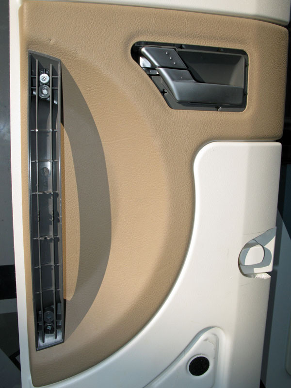 Die braunen Elemente sind mit Klettverschlüssen befestigt und lassen sich gut raushebeln; das Mittelteil nachdem der Rahmen für den Entriegelungshebel entfernt und der Türgriff abgeschraubt ist: