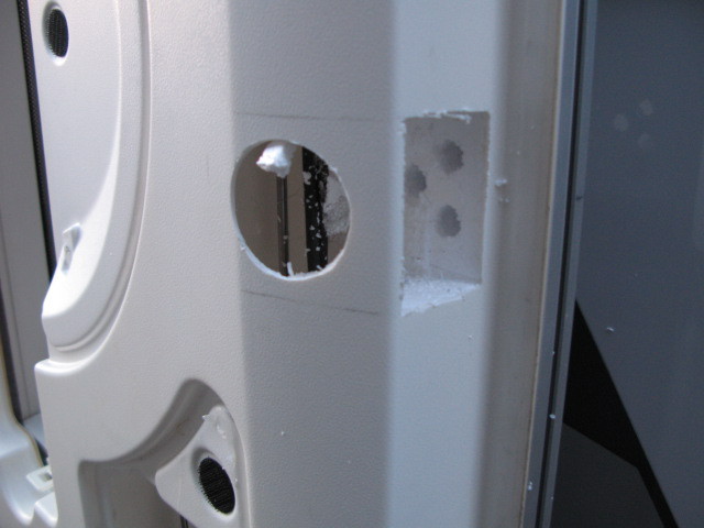 Deutlich aufwendiger war die Montage des Zusatzschlossen an der Aufbautür. Diese ist insgesamt 9 cm dick und die Innenverkleidung über die gesamte Türhöhe und –breite verklebt.