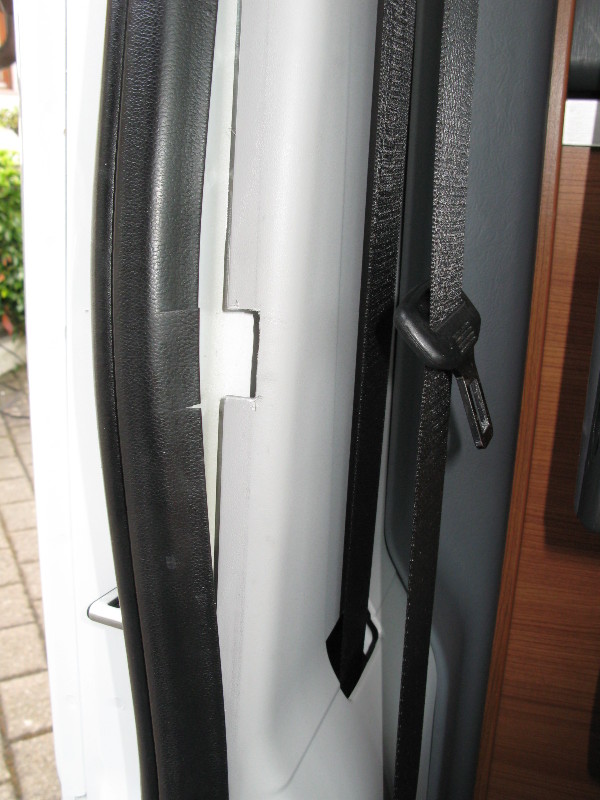 An der Remistar-Verkleidung muss die untere Ecke entfernt werden, damit sie wieder über das Schloss passt. Die als Download verfügbare Schablone passte nicht ganz, so dass der Ausschnitt etwas zu groß ausgefallen ist. Da hiermit auch der untere Befestigungspunkt abgeschnitten wurde, musste ich in den Remistar- und in den Fensterrahmen ein neues Loch für die Befestigung bohren. Damit der Riegel gut hinter die B-Säule fasst musste ich noch einen kleinen Ausschnitt in die Verkleidung machen: