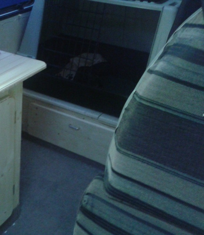 Seid diesem Jahr fährt unser Hund auch im Wohnmobil mit und wir haben nun die Box aus dem Auto ins Wohnmobil gebaut. Sie wird nach unten fixiert, so dass sie nicht verrutschen kann. Der Hund hat genug Platz zum liegen und sich zu drehen.