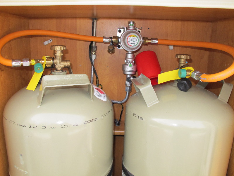 In meinem alten Kastenwagen war das zu Anfang auch so, da hat bei der Duomatic ewig das grüne Lämpchen gebrannt, trotzdem waren irgendwann beide Flaschen leer. Das hat der Truma-Service oben auf der Seiser-Alm in Ornung gebracht, da war die duomatic falsch angeschlossen. Das jetzige Mobil ist gebraucht, da sollten solche Fehler doch nach 11 Jahren behoben sein. Wenn ich Flaschen wechsel, dann schließe ich sie an, öffne die Ventile und drücke auf die drei grünen Taster der Schlauchbruchsicherung (ich nehme an, dass das eine ist, siehe Bild. Sowas hatte ich vorher nicht.). Zuerst drücke ich an den Tastern bei den Flaschen, dann den Knopf in der Mitte. Mache ich irgendwas falsch, um der Duomatic gleich die richtige Betriebsflasche schmackhaft zu machen? Tatsächlich mit der Betriebsflasche angefangen hat sie bis jetzt einmal und das auch angezeigt, die war aber beim Umschalten auf Reserve auch noch nicht leer. So siehts im Gaskasten aus: