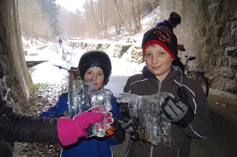Die Kinder motzen, sie haben keine Lust Fahrrad zu fahren, trotzdem gefällt es ihnen dann eigentlich doch, vor allem die Eiszapfen im Tunnel.