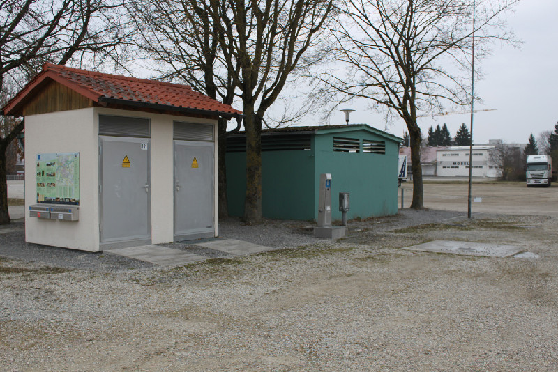 Strom gegen Gebühr vorhanden (eine Säule - 6 Anschlüsse).