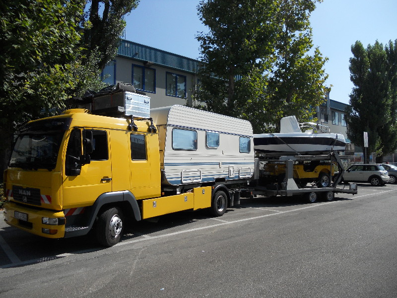 ÄH, verreisen andere nicht auch so ? :eek: ich weis ja nicht ...aber so ganz ohne Motorrad in Urlaub fahren.... ...also mir würde was fehlen ;-) Ralf Stimmt, mir fehlte auch was. Vielleicht stehts in der Heckgarage? :lol: . und alles so schön farblich abgestimmt ..... :-D ... das (geklaute) Bild muss schon ein paar Runden durchs Netz gelaufen sein, hatten wir hier schon ein paar Mal! :? ... dann bitte an die Admins oder Mods: Diesen Beitrag schließen oder zusammenführen. Wenn ich Polizist wäre, würde ich das Gespann rausziehen und auf die Waage zerren. Anhänge- und Anhängerlast definitiv überschritten ..... Aber der Einfall iss sicherlich nicht schlecht ... Im Amiland sieht man noch weitaus 'praktischere' Gespanne , Mr. hast, achte mal drauf ..... hihihihihihihi .... Fahrzeug hat sicherlich eine 3,5 t. AHK , 750 Kg der Trailer , ca. 1550 Kg der Porsche , ca. 350 Kg das Boot... Da ist keine IMHO Überladung vorhanden wobei wir uns Alle im Bereich der blossen Vermutungen bewegen :) Jan Sicher .... Vermutung .... Aber ja, Sir, Du vergisst den Metallaufbau fürs Boot, noch mal 150 kg.. Ich denke das Womo iss'n 5 tonner, der darf garantiert keine 3 Tonnen ziehen ... oder täusche ich mich so sehr? Nix desto trotz, darum gehts ja auch gar nicht .... wir wollen doch hier nur unsern Neid zeigen, wie arm wir doch sind, wie einfältig, wie .... Guck mal genau aufs Zugfahrzeug ... steht da nicht geschrieben "Eure Armut kotzt mich an" ? :mrgreen: :mrgreen: :mrgreen: Moin Ich geh mal davon aus das der Zugwagen, siehe Tandemachse, mehr als 3,5 zul.GG hat. Da kann er sich das 100er Schild am Anhänger gleich sparen. Auszug aus TÜV Info: Beste Voraussetzungen, schnell ans Ziel zu kommen Grundsätzlich gilt für Gespanne Tempo 80. Wer mit Anhänger schneller fahren möchte, kann dieses an jeder unserer TÜV-STATIONEN begutachten lassen. Mit dieser Bestätigung erhalten Sie die erforderliche Tempo 100-Plakette bei Ihrer Zulassungsbehörde. Die technischen Voraussetzungen sind: Ihr Auto ist mit ABS ausgestattet Die zulässige Gesamtmasse Ihres Autos beträgt maximal 3500 kg Der Anhänger ist für eine Höchstgeschwindigkeit von 100 km/h geeignet Die Anhängerreifen sind für 120 km/h ausgelegt und haben wenigstens den Geschwindigkeitsindex L Die Reifen sind jünger als sechs Jahre Außerdem müssen bestimmte Masseverhältnisse zwischen Anhänger und Zugfahrzeug eingehalten werden. Die gesetzlich zulässige Gesamtmasse des Anhängers zu berechnen, ist ein wenig kompliziert. Sprechen Sie uns einfach an Ihrer nächsten TÜV-STATION darauf an. Wir beraten Sie gerne. Respekt was so ein Foto ausloesen kann! Und was das 100 Schild betrifft, der haengt vllt auch mal woanders dran?! :? Ein kleiner Helikopter würd schon noch aufs WOMO-Dach passen :-) Ich kenne eine Familie, die so reist. Sie nimmt auch einen Bodygard nach Italien mit, der immer die momentan nicht benutzten Fahrzeuge überwachen muss. "Man weiß ja wie die Italiener so sind." sagte die Dame des Hauses, äh Wohnmobilses. Christel Wer bei bei denen wohl das Klo weg bringt und wie derjenige gekleidet ist. :D