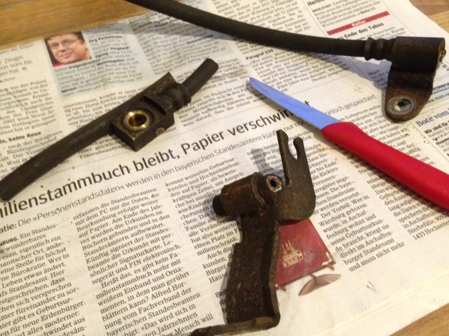 Die Wurzel des Bösen ist eine Verstopfung in dem vorderen Metallteil. Sieht bisschen so aus, als sei diese Halteklammer so fest zugerostet, dass der Schlauch zugedrückt wurde. Ansonsten sind die Schläuche nämlich in gutem Zustand innendrin!