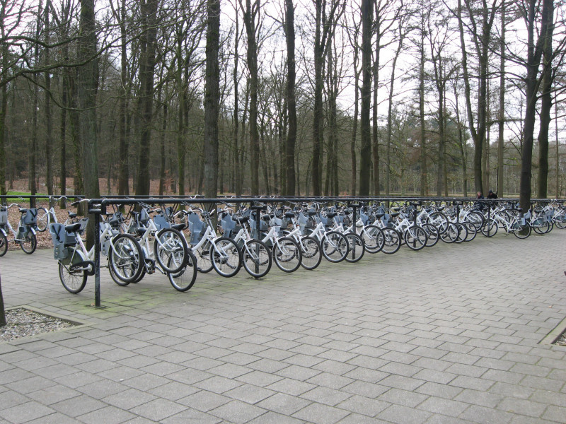 Über Landstraße und Autobahn fahren wir zum Nationalpark "De Hooge Veluwe" bei Otterloo und nehmen den Eingang Hoenderloo. "De Hooge Veluwe" ist ein riesiges Waldgebiet, mit Rehwild und Wildschweinen als Bewohnern, und kostet pro Person und Tag EUR 16,80 Eintritt. Hindurch führen Wanderwege und Radfahrwege. Die weißen Fahrräder an den Eingängen sind kostenlos zu nutzen und können überall wieder abgestellt werden.