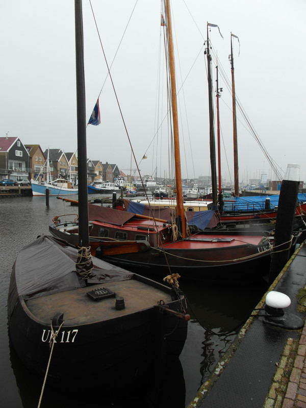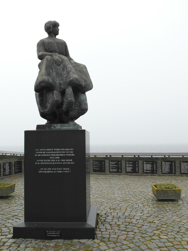 Trotz des Nebels und dem leichten Nieselregen machen wir einen Bummel durch den Ort. In den Gassen stehen die kleinen Reihenhäuser wie an einer Schnur gezogen. Es ist kaum Grundstück vorhanden. Doch viel Liebe zur Dekoration, außen wie innen, beeindruckt uns. Hinter der Kirche, zum Ijsselmeer hin, kommen wir zu einem Denkmal für die vielen "verlorenen" Fischer. Wenn ich mir einen Fisch kaufe, habe ich nie einen Gedanken daran verschwendet, wer dafür gesorgt hat, dass er bei mir auf den Tisch kommt. Gut, vom Direktvermarkter ist er frischer. Aber das eine solch große Zahl von "Urkern" nicht mehr nach Hause gekommen ist, ist erschreckend. Die "Klagemauer" hat so viele Namen.