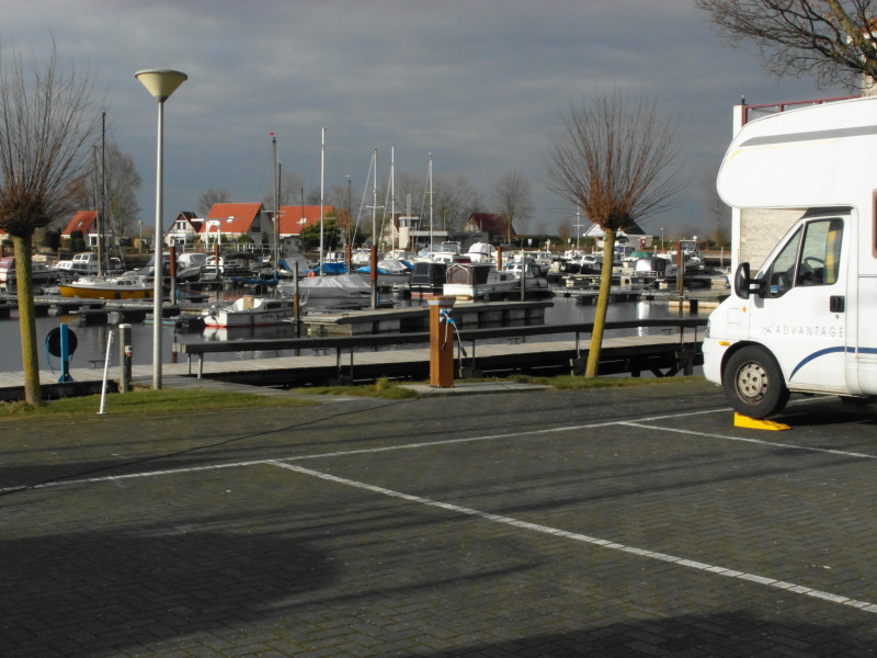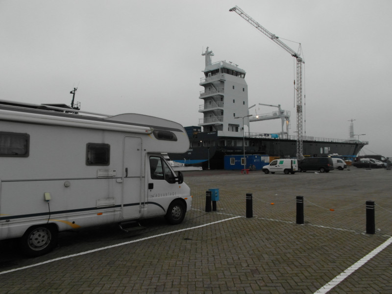 Bevor wir weiter ziehen, entsorge ich noch die Toilette und bezahle bei der Hafenmeisterin (!) meine Standgebühr von EUR 7,50 und EUR 2,00 Pauschale für den Strom. Es ist ziemlich neblig heute Morgen. Über eine gut ausgebaute Autobahn fahren wir bis Urk am Ijsselmeer. Der Stellplatz dort ist im Hafen an der Burgermester Schipperkade. Es ist ein Großraumparkplatz mit einem abgeteilten Bereich für Womos. Stromanschlüsse sind vorhanden. Die Stellplatzgebühr von EUR 13,00 wird vom Hafenmeister kassiert. Er kommt auf den Platz.