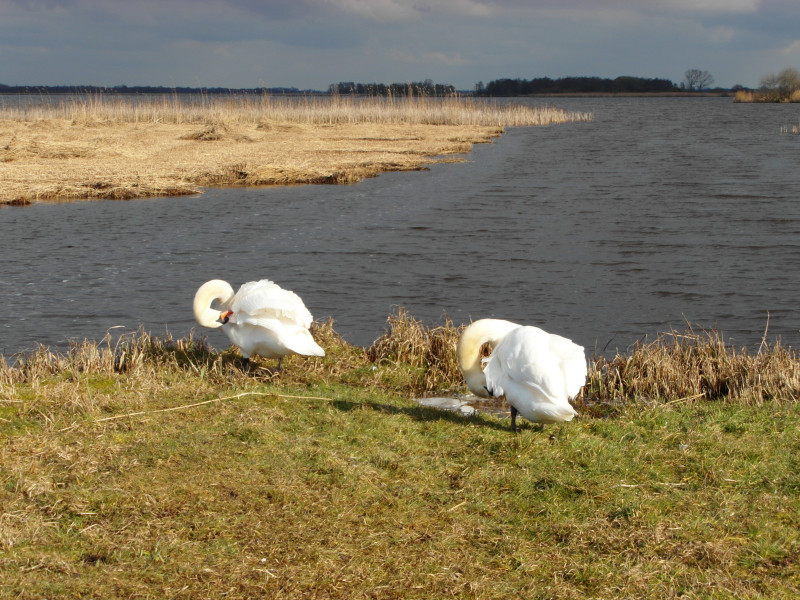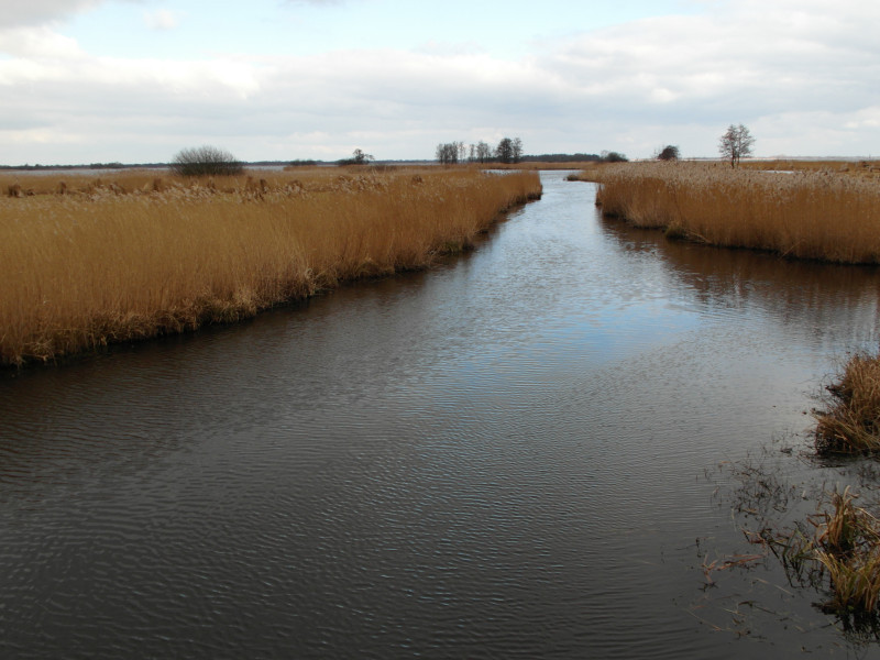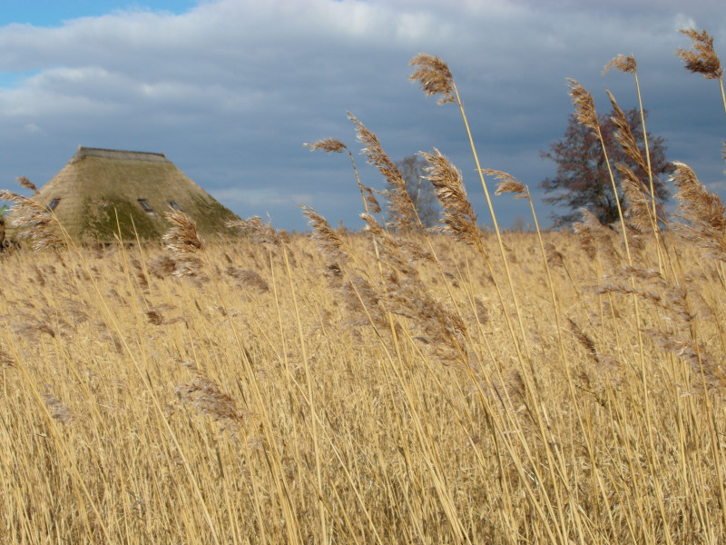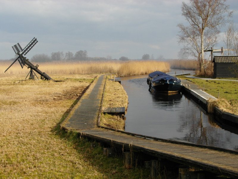 Bei der Weiterfahrt halten wir uns östlich und kommen bei Sint Jansklooster an der Beulaker Wijde, einem Moorsee vorbei. Hier ist ein Besucherzentrum, bei dem man auf festen oder manchmal auch moorigen Wegen durchs Riet wandern kann. Das interessiert uns doch sehr. Es gibt einige Informationen zum Torfabbau und zur Schilfzucht. Außerdem sieht man auf dem Spaziergang, wie die Menschen hier früher gelebt haben. Es ist ein schönes Licht über dem See, doch der Wind ist eiskalt.