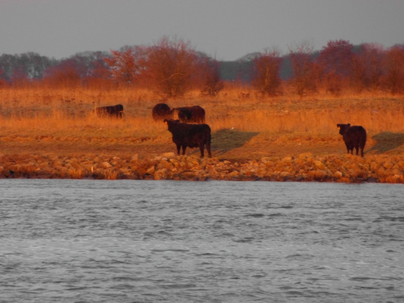 Als wir total beeindruckt aus dem Museum heraus kommen, merken wir erst, wie die Zeit vergangen ist. Nun fahren wir schnell noch weiter nach Süden auf den Stellplatz in Neer. Wir sind wieder allein und der Stellplatz ist noch im Winterschlaf. Während wir uns in unserem Womo vergnügen, fängt es draußen an zu schneien. Und zwischen den Wolkenfeldern hindurch erleben wir einen superschönen Sonnenuntergang mit ganz intensiven Farben. Die Kühe auf der anderen Maasseite stehen dort, wie auf einer sonnenverbrannten andalusischen Wiese.