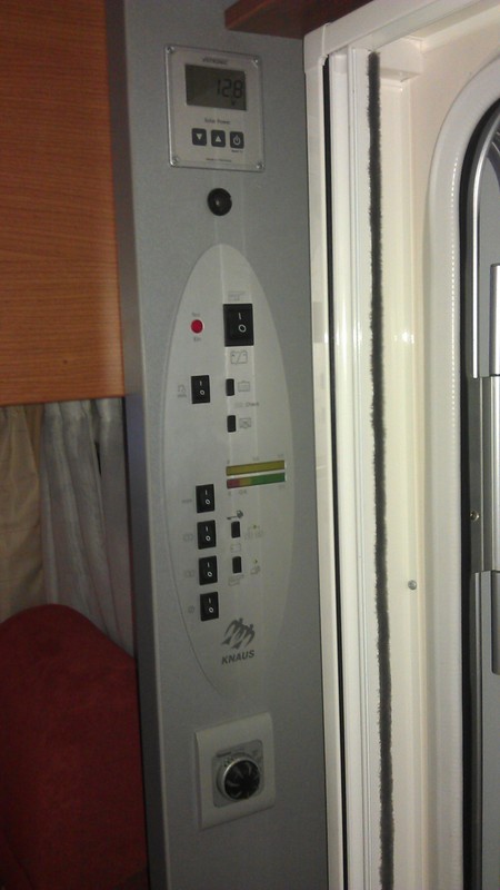 Also: Wir haben ein ovales Panel neben der Tür zum Schalten der verschiedenen Stromkreise. Das Dings hat oben einen "Hauptschalter", der etwas größer ist als die anderen. Dann kommt ein Schalter für die Wasserpumpe, zwei Reihen LEDs für die Wasserstände Frisch/Abwasser bzw. Ladezustand Batterie vorne/hinten. Dann kommen untereinander vier Schalter, die mit Lampensymbolen bezeichnet werden. Die ersten drei schalten verschiedene Stromkreise im Womo an. Der vierte wirft Fragen auf. Man muss (!) ihn mit dem Hauptschalter zusammen betätigen, damit überhaupt etwas geht. Nur warum ist der da?