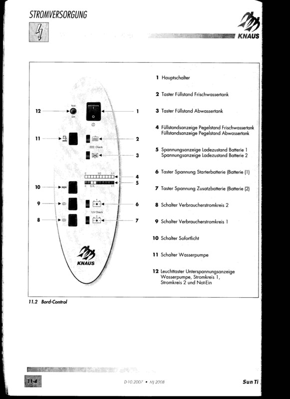2. Irgendwie wüßte ich gerne, was an welchem Schalter angeschlossen ist. KNAUS hat mir nach langem Gezerre einen Stromlaufplan geschickt. Ich musste dazu sogar eine Haftungsfreistellung unterschreiben, in der ich Ihnen bestätige, sie nicht zu verklagen, wenn ich Mist baue. Naja. Eine Woche Mails hin und her, viel Zeit verbraucht für nix. Jetzt sehe ich mir mal den Stromlaufplan an.