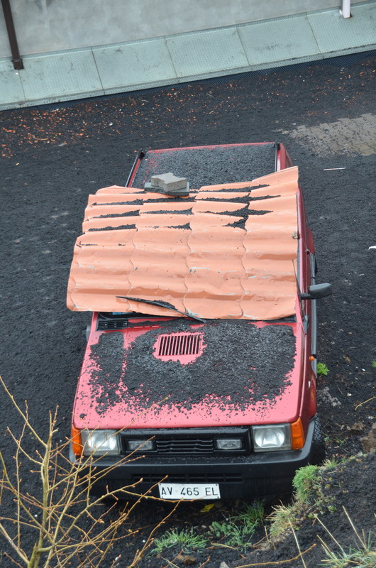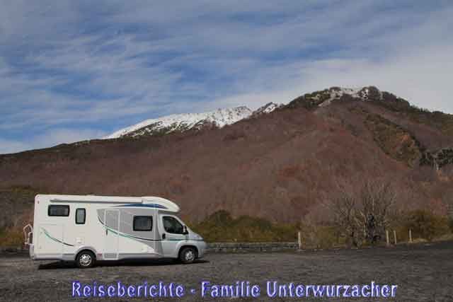 Naja "gemütlich" ist vielleicht übertrieben: Die Nacht bricht herein, der Regen und der Wind nehmen stark zu und die Gegend wirkt einsam. Zuerst werden die Häuser weniger und die Besiedelung hört ganz auf, dann passieren wir auch die Baumgrenze. Ich suche einen Übernachtungsplatz und stelle unser Wohnmobil in einer Stichstraße, mitten in einem alten Lavastrom. Die Aussicht auf die Küste muss bei Sonnenschein und Tageslicht beachtlich sein - der Sturm ist es allemal. Alleine und verlassen stehen wir auf ca. 1500 Meter Höhe und unser Wohnmobil wird ordentlich vom Sturm hin und her geschaukelt. Eigentlich hatte ich heute schon genug Abenteuer und was ist, wenn der Regen in dieser Höhe in Schneefall übergeht und wir morgen mit unseren Sommerreifen im Schnee stehen? Also, vernünftig wie wir sind, fahren wir ein paar hundert Höhenmeter hinunter auf einen kleinen Parkplatz: Hier ist es ruhiger und so können wir nach diesem ereignisreichen und intensiven Tag erschöpft in's Bett fallen ...