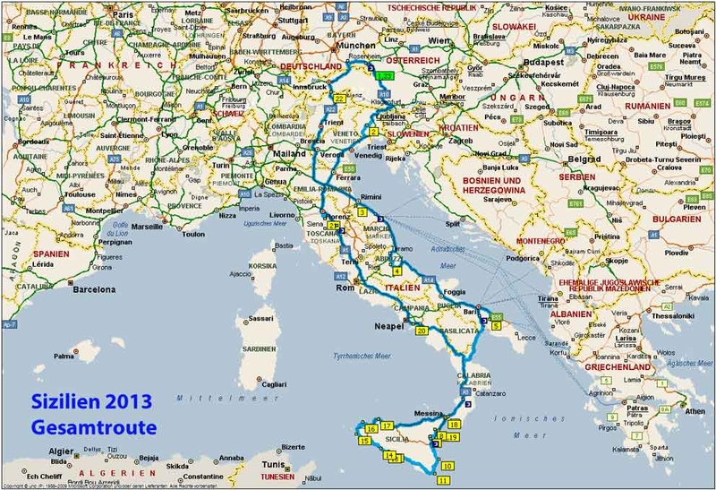 Tour: Kuchl - San Marino - Castel del Monte - Trulli de Alberobello - Taormina - Gola dell Alcantara - Etna - Siracusa - Portopalo di Capo - Agrigento (Tal der Tempel) - Porto Empedocle - San Vito lo Capo - Isola delle Femmine - Palermo - Pompeji - Greve - Kuchl (4876 km)