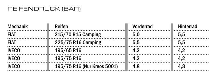Verstehe ich auch nicht nicht. Ich halte mich an den Wert, denn der Reifenhersteller mir für die maximalen Achslasten (die ich nicht erreiche) empfiehlt: 3,8 vorn und 4,4 hinten. Bei der telefonischen Beratung war der Mitarbeiter sehr erstaunt, als ich sagte, dass in Womo-Kreisen 5,5 üblich sind. Er sagte: "Oh je, dann dotzt der Wagen ja nur." Frank Bei mir sind vorgegeben (Dethelffs BJ 2013) 5,0 & 5,5 Bar bei einer Achslast von 1,9t & 2,0t, total max. 3,85t - Aufkleber an der B-Säule. Da der Aufkleber auf italienisch ist gehe ich davon aus - original FIAT. Mein alter Detheffs BJ 95 hatte jeweils 4,5 Bar bei max. 3,5t gG Hallo Ich halte mich bisher an die Betriebsanleitung von FORD für meine Basis und gebe 3,5 vorne und 4,2 hinten rein. Bei meiner Betriebsanleitung von Ford mit Zwillingsbereifung steht hinten 3,8 und vorne 4,2 didje Hallo, ich verwende diesen hier: Amazon Link ist eine Neuanschaffung und ich habe es am Wochendende ausprobiert. Riesen Vorteil ist, man kommt durch den Akkubetrieb an jeden Reifen ran. Schafft ohne zu keuchen die 5,5 bar an meinen Reifen, danach war der Akku noch über der Hälfte der Anzeige nach voll. Das Ding ist recht handlich und kann über 12 und 240 Volt geladen werden. Fahrradaufsätze und Ballaufsätze sind auch dabei. Und, er ist nicht so höllisch laut :) Ansonsten habe ich auch noch die schon gezeigte Michelin Einzylinder Fussluftpumpe. Das ist auch ein wirklich robustes und genaues Gerät. Eine Fusspumpe von Alpin hatte ich, nachdem ich etwas schräg darauf getreten war, zerbrochen. Dieser Billigkauf hatte sich damals nicht gelohnt. :( habe einen 8Bar Kompressor (230V) an Bord . Damit geht es sehr gut. Hallo, vor zwei Jahren hatte ich die Faxen dicke mit Reifenwechsel an drei Autos und seit 2011 auch noch Womo. Anschließend immer an die Tanke fahren. Hab mir dann einen Kompressor gekauft für 99 Euronen, mit allem Zubehör, 8 bar Druck, 25 Liter Behälter. Wird jetzt dadurch öfters überprüft und die Räder auch noch gefüllt vor der Urlaubsfahrt. Dieter Mobil habe ich den dabei: --> Linkäzision.de/produkte/reifenfuell-und-messgeraete/reifendruckmessgeraete/mini-koffer.html Gibt auf dem Markt kaum was besseres zu kaufen. Solche Digitaldinger hatte ich auch schon verschiedene (Testsieger), aber die zeigten nach wenigen Monaten eher den Wasserstand des Rheins an, als den Luftdruck der Reifen. Mit dem Flaig und der großen Flaig Uhr zu Hause überprüfe ich 2 bis 3 mal im Jahr die Tiremoni Sensoren. Die funktionieren seit 2009 ohne Abweichung. |