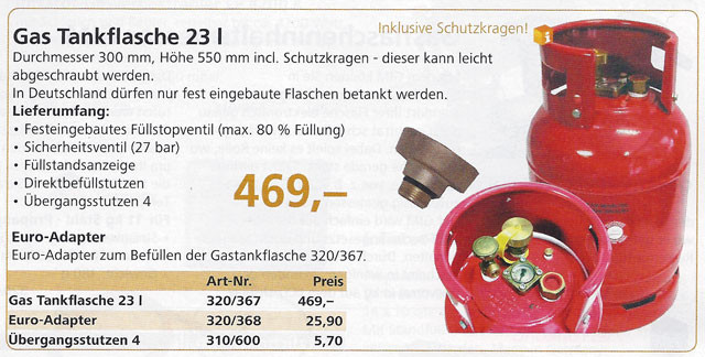 Leider nein, gescannt aus dem aktuellen Frankana Freiko Katalog 2013: ![]() Heißt aber nicht, dass man dort kaufen muss, oder das besonders gute Preise wären oder gar eine Empfehlung von mir, sollte lediglich der ersten Orientierung dienen. Ich suche nicht nach einer Gas-Tankflasche, habe auch noch nie danach gesucht (wir werden einen Gastank haben...), daher weiß ich nicht, wo es am günstigsten ist, aber dazu gab es hier ja auch schon diverse Hinweise... danke für den freundlichen Hinweis! wie geschrieben, der angegebene Preis in dem Scan scheint mir jenseits von gut und böse und verleitet eher dazu dort nicht kaufen! Hier für weniger als die Hälfte ![]() Dieter