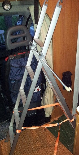 Da ich überlege, die SAT Schüssel durch das Heki auf das Dach zu stellen, brauche ich eine Leiter. Natürlich will ich keine mitschleppen. Andererseits habe ich durch die Heckstockbetten und den Alkoven schon 2 Anstellleitern im Womo.