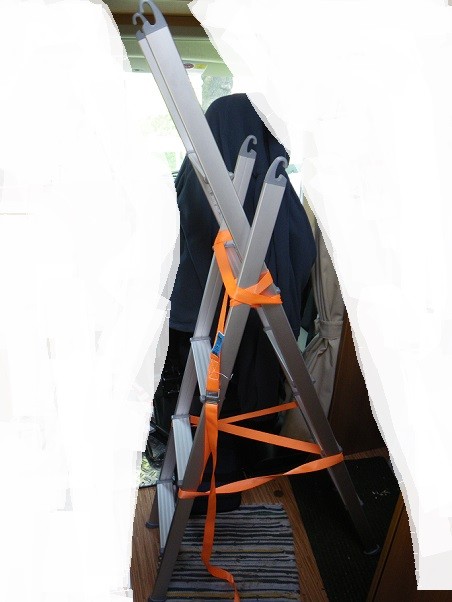 Man muß improvisieren können, mit den vorhandenen Mitteln und der Spanngurt sieht auch so aus, als würde er für große Belastungen geeignet sein. Allemal besser als auf Sitzbänken und der Küchenarbeitsplatte rumzukraxeln. Damit die undankbare Meute dich hier nicht steinigt, solltest du einfach ein paar von deinen Sitzbankpolstern drum rum legen. Ich hab leider nur eine Leiter und sie in den Keller verbannt. Ich stell immer meinen Campingtisch in die Mitte und einen Campingstuhl darauf. Wenn der Gips ab ist, mach ich mal Fotos.