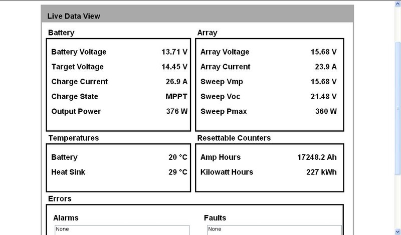 Und ich hab heute unsere Panele in Reihe geschaltet, da ich ein 24V Modul mit kleinen Abmessungen gefunden habe, nun hat unser Regler auch endlich mal richtig zu tun. Das 24V Modul hat aber eine Leerlaufspannung von 48V, die Panele in Reihe aber nur 41V bzw. 42V (2x120Wp, 2x80Wp). Sollte aber keine großen Probleme geben, oder?