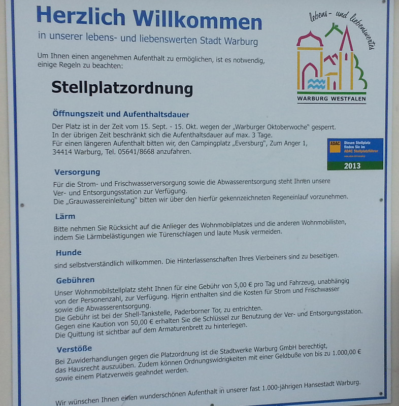 Der SP liegt zentrumsnah an der sehenswerten Neustadt, die allerdings gar nicht so neu ist, nämlich aus dem 13. Jahrhundert. Den SP umgibt viel Grünfläche, und es ist dort relativ ruhig. Bezahlung (5 €) und Schlüssel für V+E +Strom: an der gegenüber liegenden Shell-Tankstelle. Von Mitte Sept. bis Mitte Okt. ist der SP geschlossen wegen der „Warburger Oktoberwoche“. Hier noch 2 Bilder- Platz ist da ohne Ende. Aber schöne Stadt hätte etwas Besseres verdient. ![]() ![]() |