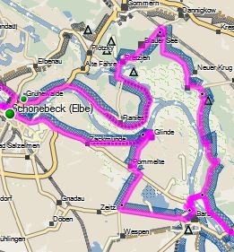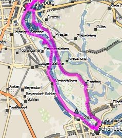 Über Elberadweg linkselbisch bis Fähre Rogätz, dann rechtselbisch bis Fähre Ferchland und wieder linkselbisch biszum SP ca. 60 km.