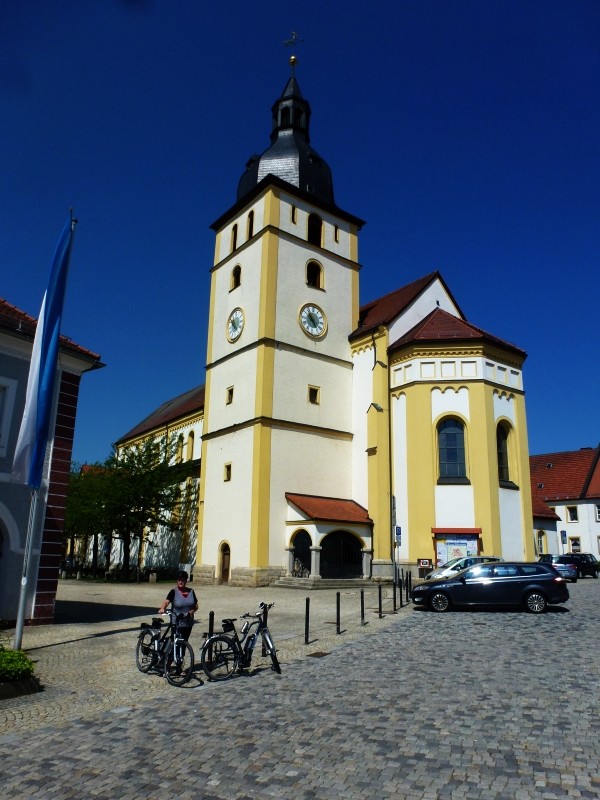 Bei uns in Gastn brauche ich nicht über die Landstraßen fahren um die Gegend zu sehen, denn die kennen wir schon. Darum geht es gleich auf die Autobahn in Richtung Bayerischer Wald und Grenzübergang nach Tschechien. Da wir nicht rasen, ist der erste Halt nach rd. 300km noch in Deutschland, in Mitterteich, kurz vor der Grenze. Wir stehen auf dem Stellplatz oberhalb des Ortes am Großbüchelberg. Von dort hat man eine grandiose Aussicht auf die Gegend bis hinein nach Tschechien. Spontan beschließen wir, weil es dort so schön ist, zwei Nächte zu bleiben und nehmen die Pedelecs vom Fahrradhalter. Jetzt kommt die Bewährungsprobe für die Bikes.