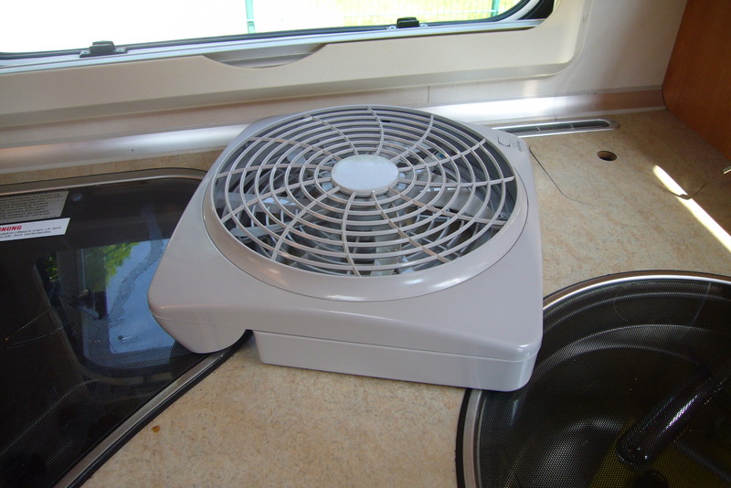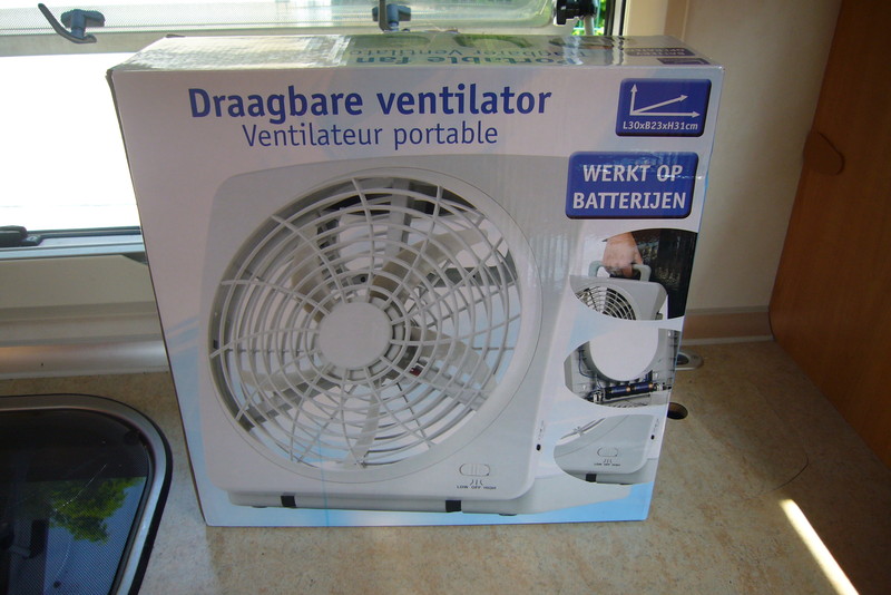 Das Dingens läuft über Batterien oder über den 12 V Anschluss. Ein Kabel war allerdings nicht dabei, hatte aber den passenden Stecker noch im Keller gefunden.....Stecker für Zig.-anzünder auch noch. Somit war ein 3m langes Anschlusskabel fertig. Geplant war eigentlich, ihn im Hochsommer vor ein geöffnetes Fenster zu stellen (Heckbett oder Alkoven), um ein wenig kühle Abendluft ins Womo zu bekommen. Und das tut er übrigens richtig gut. Ok, auf höchster Stufe kann man ihn nur laufen lassen, wenn man nicht im Womo ist. Der Geräuschpegel ist dann schon recht hoch. Aber selbst die kleine Stufe bringt richtig was. Ich hätte dieses Plastikteil hier allerdings nicht erwähnt, wenn es nicht die Genialität besässe....das es genau in's Mini HEKI passt. Somit hat man eine Fiamma Vent für Arme :D