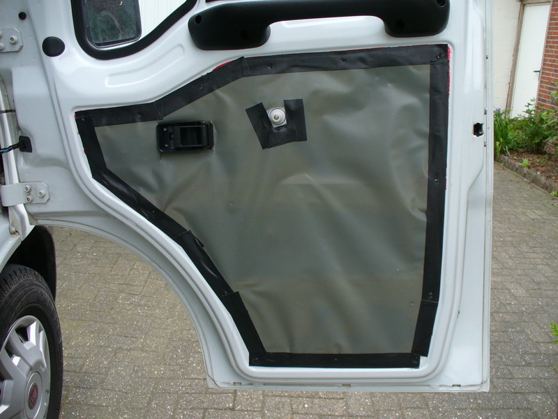 Dann habe ich die Innentür wieder mit Folie verkleidet, um Feuchtigkeit fernzuhalten.
