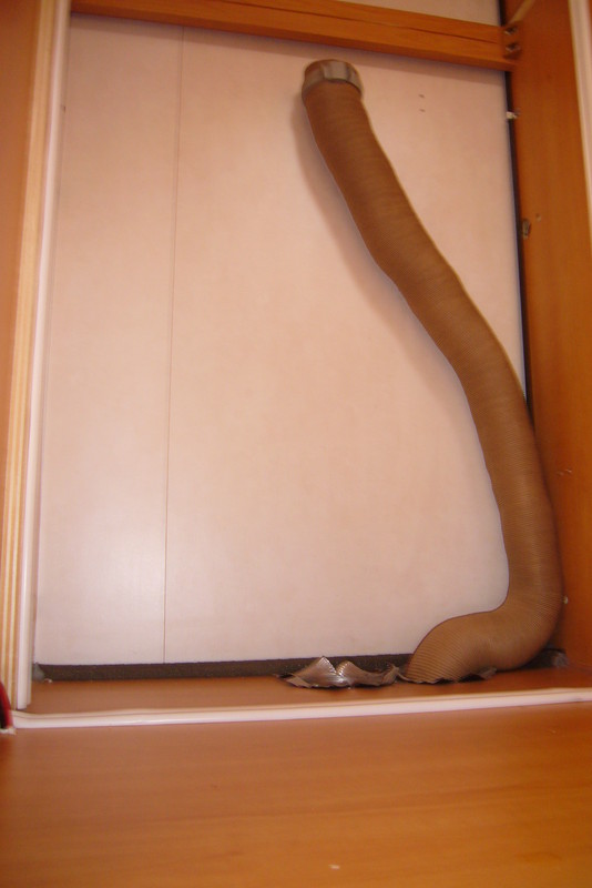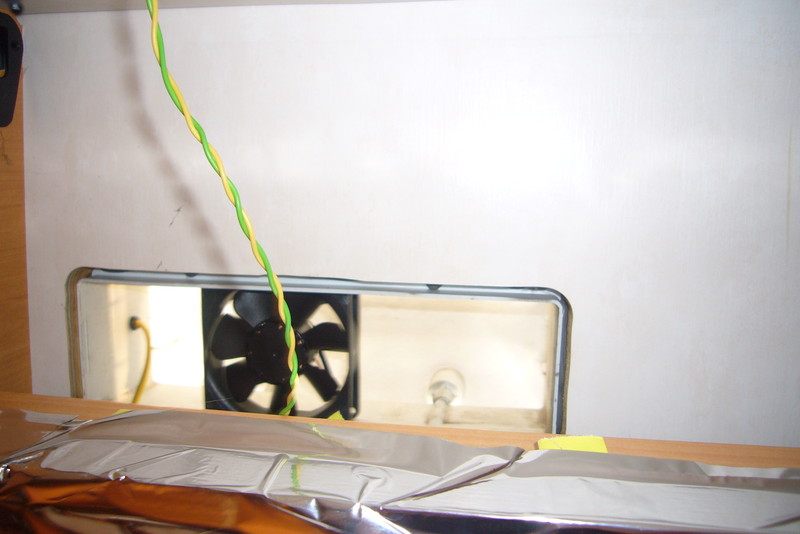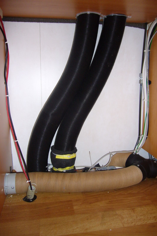 Um der Be-/ Entlüftung etwas auf die Sprünge zu helfen, installierte ich in einem der beiden schwarzen Belüftungsrohre (die vom Unterboden Luft "ansaugen") einen 60 mm Rohrlüfter & legte den Auslass so, das er ca. 25 cm unter den Kühlrippen des Kondensators endet. Der 80 mm Lüfter im Dachkamin war noch von den ersten Versuchen über.