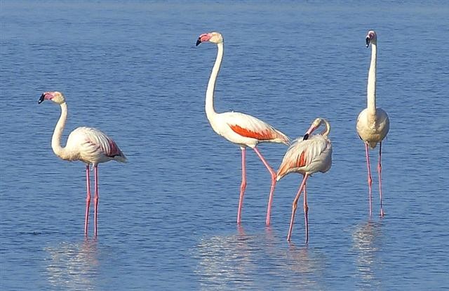 Am Abend lassen sich vor uns plötzlich einige Flamingos nieder, um ihr Abendessen zu suchen und am nächsten Morgen beim Öffnen der Jalousien stehen noch mehr dieser schönen Vögel ganz nah vor unserem Campingbus im Wasser.