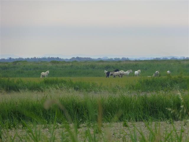 Nach drei Tagen am Strand mit "Sonne pur" setzen wir bei bei bewölktem Himmel unsere Reise fort. Zunächst passieren wir den Aussichtspunkt an den Salinen und fahren dann auf einer schmalen Nebenstraße durch die Camarque. Wir werden "belohnt" mit dem Anblick der "wilden" Camarque-Pferde, die mal in kleineren, mal in größeren Gruppen im flachen Gelände zu erkennen sind.