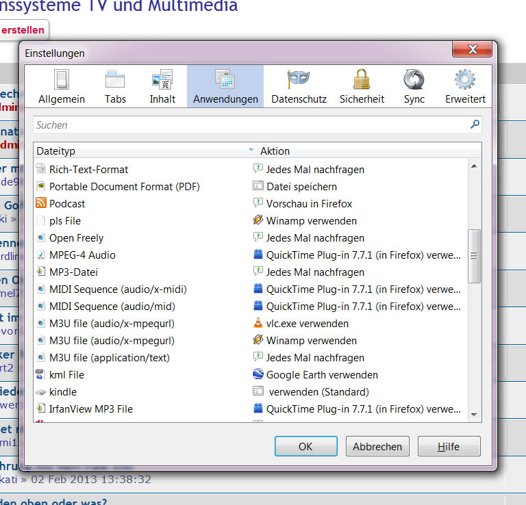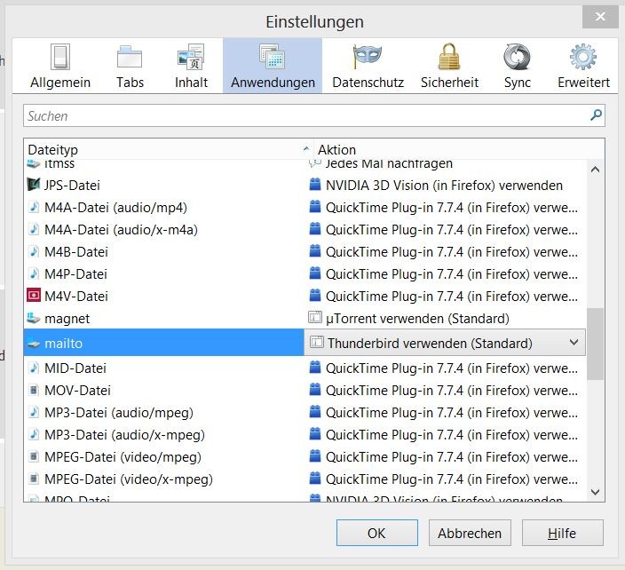 Bei mir ist unter /Extras/Einstellungen/Anwendungen/ in der langen Liste kein mailto definiert, wie lege ich eine neue Definition an? Manfred ..im Firefox sollte das so aussehen, wie auf dem Bild unten. Wenn der Eintrag "mailto" fehlt, im Firefox die Konfiguration (about:config) aufrufen. Darin den Wert "network.protocol-handler.external.mailto" suchen und wenn er auf "false" verstellt ist, per Doppelklick auf "true" zurückstellen. Danach funktionieren sollten die mailto-Links wieder funktionieren. ![]() Hi Thomas, vielen Dank für den Hinweis! Siggi